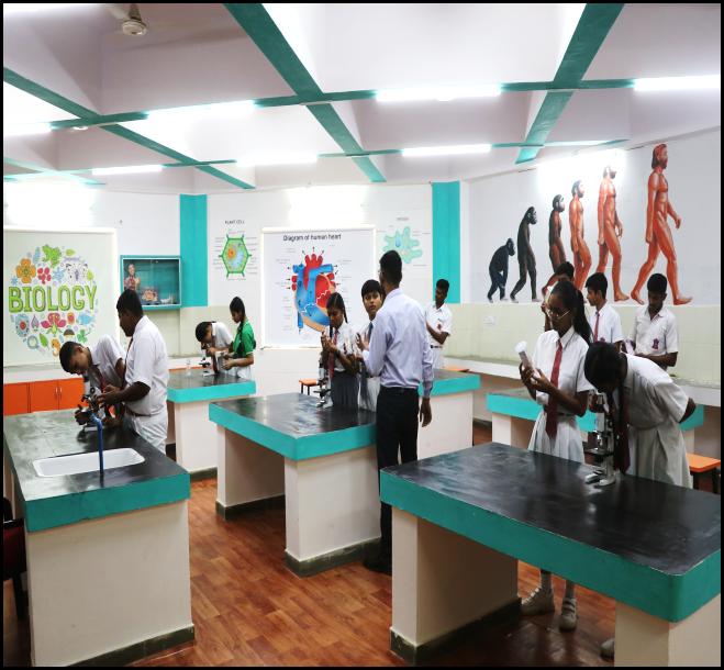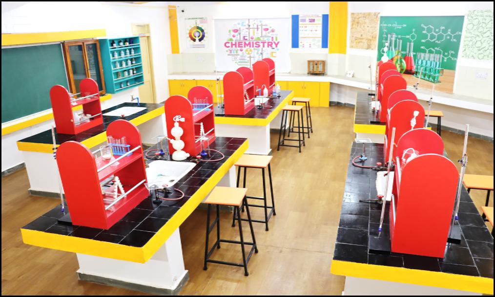 Study of chemistry is not possible without a Laboratory. Students learn by “learning by doing method” which is the best method. Our chemistry Lab is for the students of class VI to X. Chemistry Lab is well furnished, well designed and well equipped with Apparatus and chemicals.At a time a group of 25 students can perform experiment in the Lab with all safety measure (Fire sensor, fire Extinguishers) and first Aid Box are placed in the Lab. Separate store room is designed in the Lab.